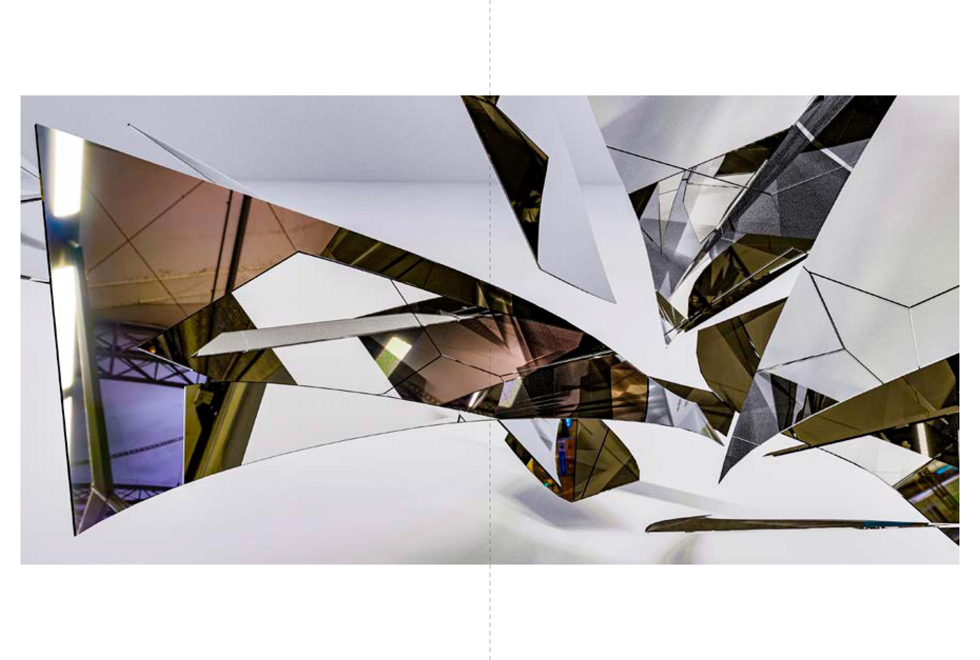 割れた鏡の破片に都市の写真が映り込むイメージが、コンピューターグラフィックスと身体的なドローイングの流れを駆使して表現されています。